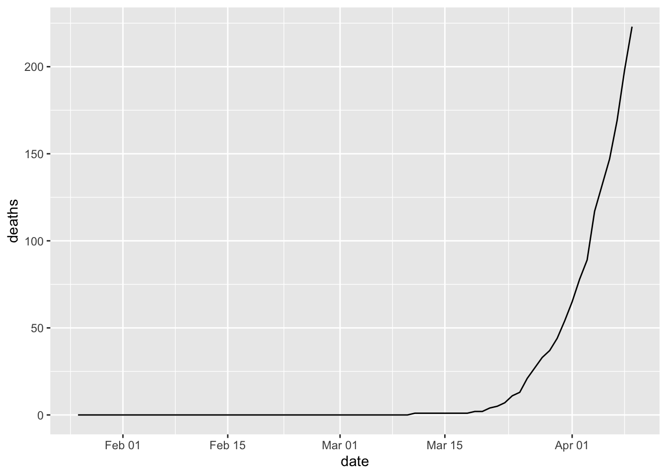 covid %>% filter(county==mycounty) %>% ggplot(aes(x=date, y=deaths, group=1)) +